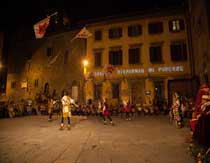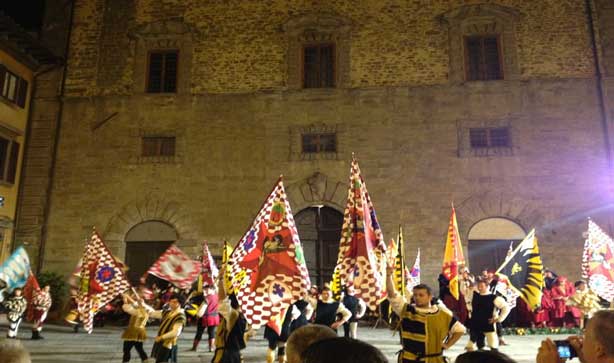 Scende la notte, ma la città è ancora sveglia; squillano le chiarine e rullano i tamburi, mentre la piazza prende i colori delle bandiere che volteggiano nell'aria, che ondeggiano e frusciano sotto le mani esperte degli sbandieratori. Il Gruppo Sbandieratori e Musici della città di Cortona ,insieme ai gruppi ospitati, si esibisce in meravigliosi giochi di bandiere e musiche medievali, facendo sussultare il cuore di tutti gli spettatori presenti.