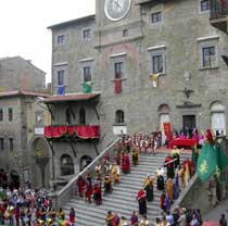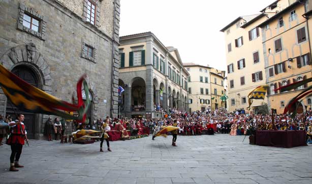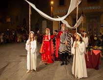 Il grande giorno è arrivato! Tutta la città è in festa: dame, cavalieri e fanciulli sfilano, in bellissimi abiti medievali, lungo le vie di Cortona, al ritmo incalzante di tamburi e chiarine.