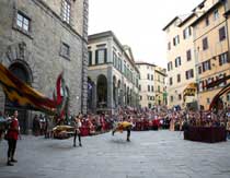 La piazza oggi è un tripudio di colori, di drappi, di fiori. Il banditore annuncia ad uno ad uno l'ingresso dei rioni.