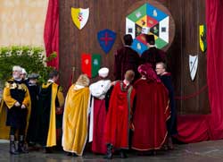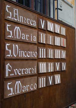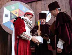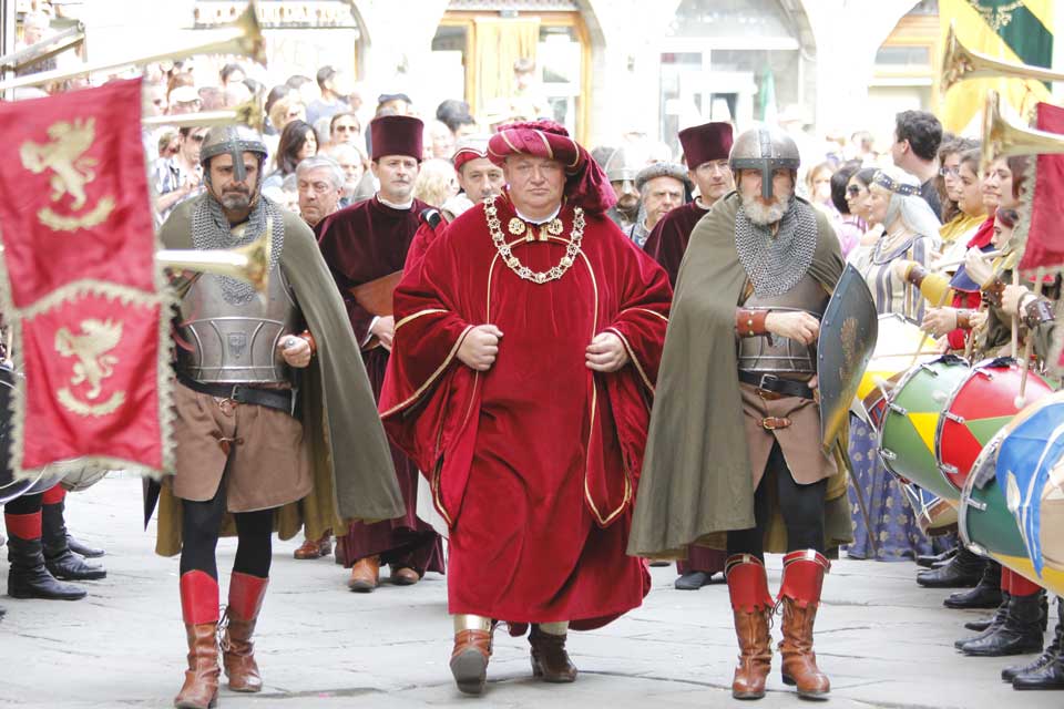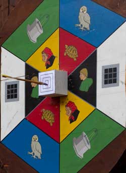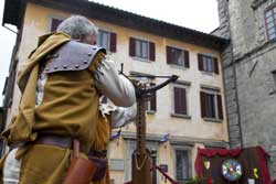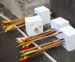 Giostra: la gara si disputa da una distanza di 20 m., con unica linea di tiro. Il bersaglio è costituito da un dado di cm. 15 di lato, posto al centro di un “Tondo” in legno; sul dado sono delineati, in forma concentrica 4 settori con punteggio Positivo da 1 a 4 e uno “Spillo” centrale di 2,5 mm di diametro, che assegna punti 5. Circoscritti al dado sono disposti 6 settori con simbolo, colore e punteggio Negativo diverso: